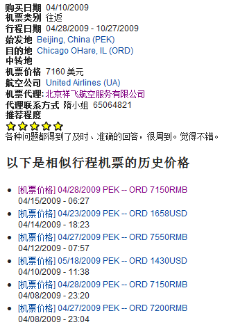 比如你查看某个网友汇报的PEK-ORD最新价格页面,下面可以看到前面所有网友汇报的PEK-ORD的历史价格,以便参考。